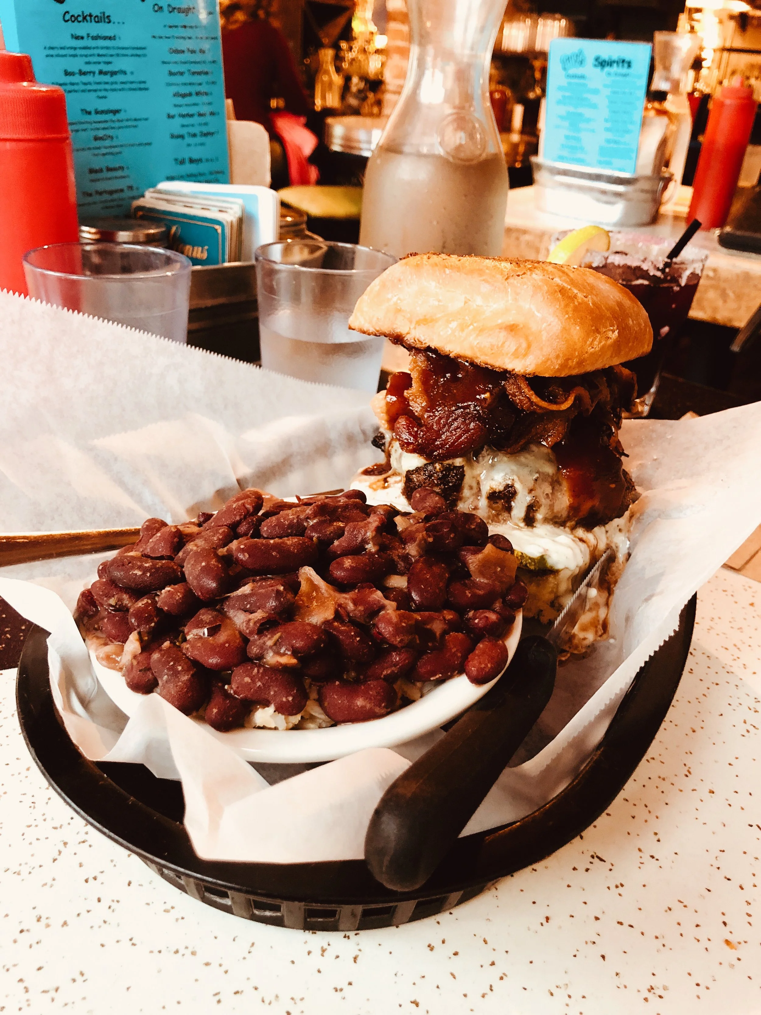 Bleu Swayed ‘Cue A hamburger with pickles, cheddar, bbq sauce, bacon, caramelized onions & bleu sauce